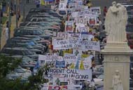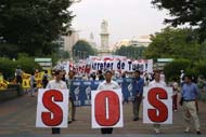 从国会大厦上放眼望去,弟子们白衣如雪,秩序井然。满目都是横幅和图片,满目都是巨大的三个红色大字--“SOS”。在弟子们各就本位之后,新闻发布会正式开始。