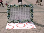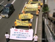 中午一点到三点全体学员开始从市民广场出发,沿仙台市主要街道绕行一周和平洪法,SOS紧急呼吁救援中国受虐待法轮功学员。在出发之前全体学员单手立掌再发正念,铲除三界内的一切邪恶。随后学员们手举“法轮大法”,“真善忍”、写有被迫害致死学员名字的松枝环绕的白色花圈及“SOS紧急救援中国受虐待法轮功学员”等横幅、旗帜,在“普度” 、“济世”音乐声中开始了游行。游行中有一段步行街,两边都是店铺,禁止放音乐、发报纸。学员们就举着横幅默默地行进。学员们印有”法轮大法” 、“真善忍” 、“SOS”的黄色、白色T恤衫和横幅的内容还是吸引了人们的注意力。由于街道窄,人们能清楚地看到横幅上的字,几乎人人都在读“SOS紧急救援中国受虐待的法轮功学员”,有人在小声议论。七月的骄阳似火,学员们一直在平静祥和地缓缓行进,包括老人和孩子。学员们默默地向世人昭示着大法的庄严神圣、迫害的残酷暴虐,慈悲地唤醒着人们的善念和良知。