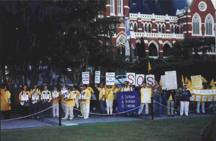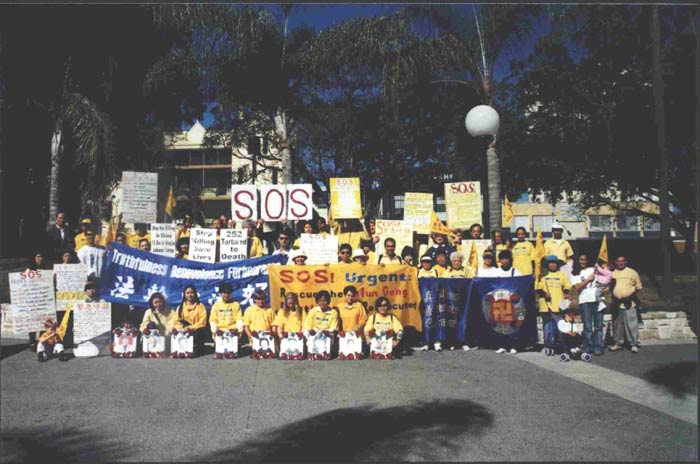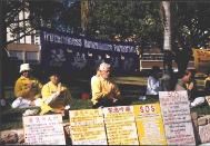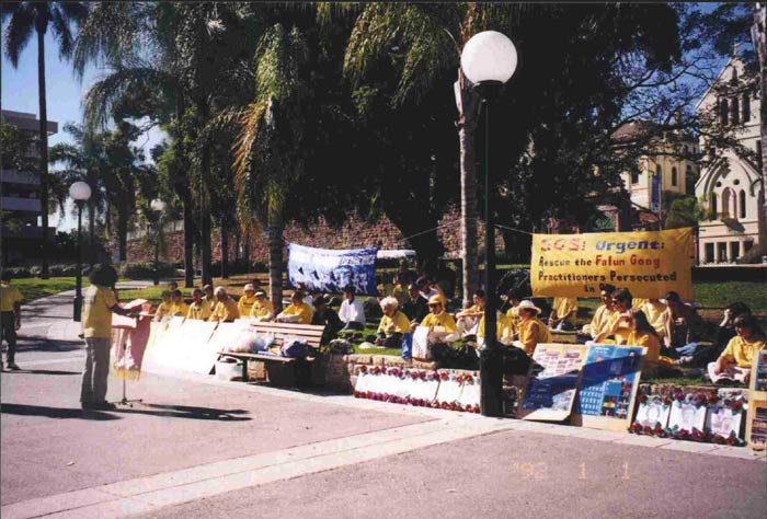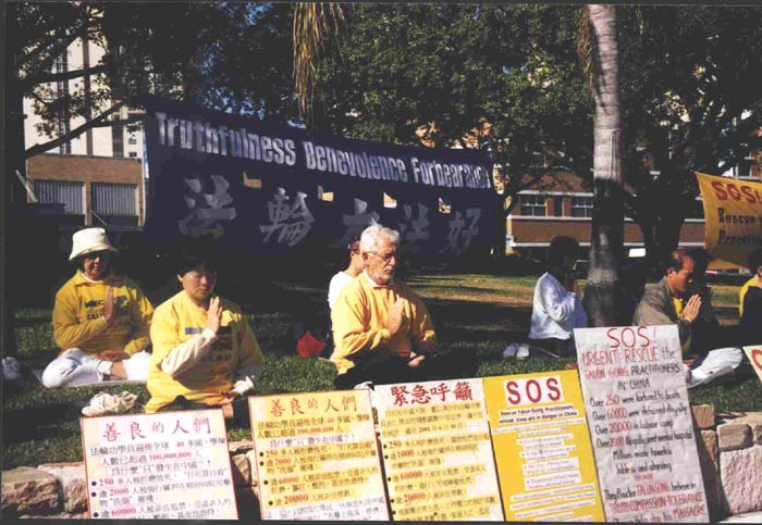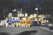 10点开始大家集体发正念清除邪恶,接着又开始了五套功法动作展示。随后由中西方学员用中英文发表讲话,抗议江泽民犯罪团伙残酷迫害法轮大法两周年,紧急呼吁国际社会营救中国的法轮功学员。