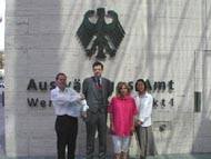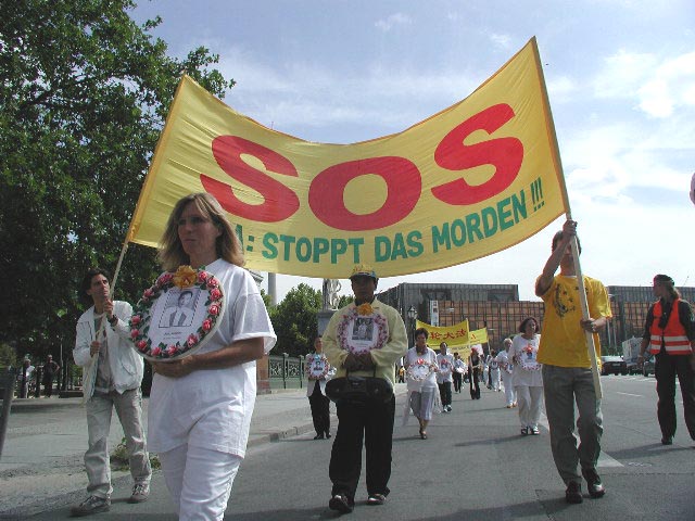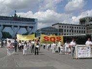 行进中,我们在大街上发报纸,几名同修向大臣贾斯卡·菲思克尔(Joschka Fischer)递交了众多民意签名。当“SOS呼吁紧急救援”游行队伍到中国大使馆时,我们遇到了在那里坚持请愿200小时以上的大法弟子们。大家在一起进行了集体炼功并散发了介绍大法和揭露迫害的传单。