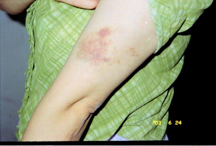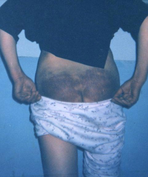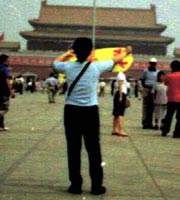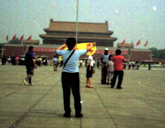 打我们打够了,邪恶之徒才想起电梯没动,才去启动电梯。我和姐姐被从电梯拖到一间屋子的过程中,一直在向游人呼喊着:"法轮大法好!" 他们打完我们后问:横幅是藏在什么地方带进城楼的。我和姐姐想到了恩师的经文《大法弟子的正念是有威力的》中的话:"无论在任何环境都不要配合邪恶的要求、命令和指使。大家都这样做,环境就不是这样了。"所以我们都不配合邪恶的要求,邪恶之徒对我们又是一阵毒打。最后看我们真的不说就叫了一辆警车,把我们连拉带拖弄到了警车上。我们说:我们没有犯法,你们不能带我们走。邪恶之徒问刚才那两个打手,刚才打没打,邪恶之徒居然撒谎说没打。我心里想:你们一定会偿还你们所干的一切。