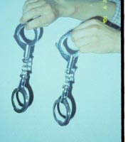 他们说不动我们,就准备押我们回当地。我和姐姐一直在想:不能消极承受,不能配合邪恶,我们一定要走掉。车到了高速公路加油站需要加油,我们提出上厕所,他们就在外面看着。厕所里的窗户开着,我就准备走掉,可这个时候邪恶之徒正好过来了,他说干什么,我没理他。当时就应该发正念把他定住,可没有想到,怕心也出来了,这是因为对师父的大法不坚定、不正信,被常人的许多观念带动所造成的。这下邪恶之徒对我更加严密控制,给我带上两副手铐,一幅带在左手与车扶手上,一幅带在右手与姐姐的左手上。不但给我多加了一副手铐,这个邪恶之徒(枣阳610办 张科长)还骂我、打我。我一直在心中默念师父的经文《大法弟子的正念是有威力的》,在心中还有一念:我们一定要走掉。