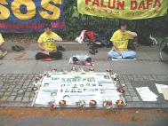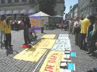 大幅醒目的“SOS”,“1999年7月以来,255名法轮功学员在中国被迫害致死”,“真,善,忍”等横幅,及用鲜花和蜡烛围起来的图片,使得几乎每一个过往的行人都要驻足仔细观看。大法弟子身于闹市,炼功时的那份安祥与宁静,也深深地吸引着人们。人们主动向我们要大法资料,主动地在我们的征签表上签名。许多人与我们长时间交谈,询问。更可贵的是许多中国人不仅接资料,还询问一些问题,如“自焚”这一类使他们迷惑的问题。当他们听了真相介绍,若有所思地离去时,我们心中是一份欣慰,又一个生命走出了谎言,走向了觉醒,结缘大法。