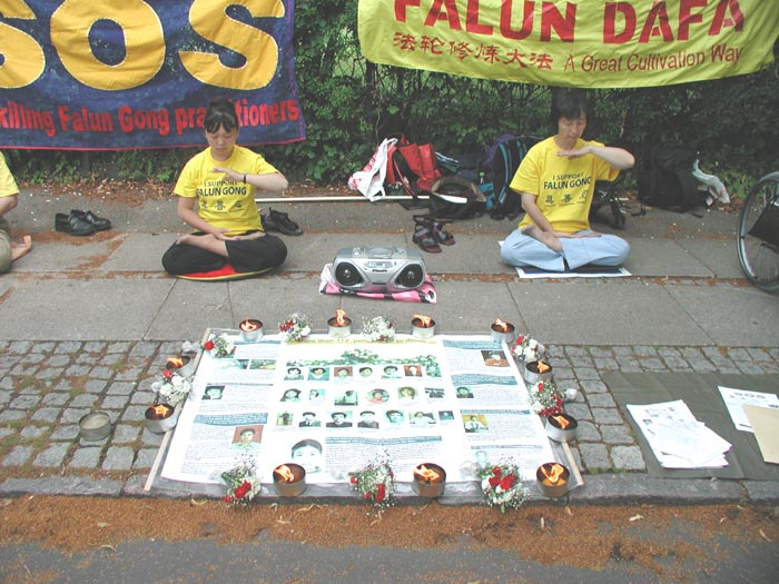 由于有部分学员将要参加华盛顿的世界救援活动及法会,我们把“7.20”两周年的纪念活动提前到今天进行。我们在使馆前挂上了学员们连夜赶制出来的“SOS”大横幅,在被迫害致死的大法弟子遗像前摆上鲜花,点上蜡烛,气氛庄严肃穆。