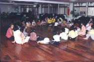 第二天早上八点半开始学炼第三套功法,我们把已学会和完全不会的分开教导并规范动作,也在其中拍照。接下来读法、读《洪吟》,很多小弟子都会背了。接著说故事与交流,然后是活动,美劳画小弟子们心中的天国世界,约六人一组,有法轮、天空、彩虹……等许多东西。下午依序是说故事、学法、吃点心、看影片,学炼第一套功法。整个活动一直到星期日下午四点多为止。