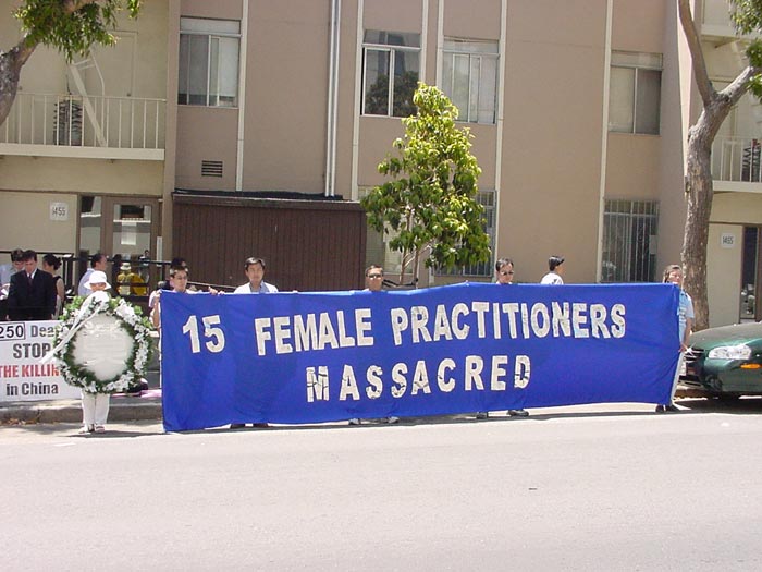 惊闻黑龙江哈尔滨市万家劳教所15名大法弟子被致死的噩耗,旧金山湾区100多名法轮功学员和支持者7月3日下午顶着烈日在中国领事馆前请愿并召开新闻发布会,强烈抗议江泽民流氓集团的迫害,要求立即停止镇压。学员们呼吁媒体对此惨案进行调查,并呼吁社会各界紧急救援在中国的法轮功学员。学员在给领事馆的一封信中说:江泽民一夥出于一己之私,不惜损害国家和民族利益,对成千上万的法轮功学员进行法西斯的惨无人道的迫害,再一次把中华民族推向灾难的边缘。作为中国政府在海外的代表,我们在此呼吁你们转达海外华人对万家劳教所惨案的严重关注和强烈愤慨。在二十一世纪的今天,在中国大地上居然还在上演这种为贯彻独裁者一人意志而肆无忌惮地残害无辜人民的一幕,这是中国的耻辱,所有中国人的耻辱!我们强烈呼吁总领事先生向中国政府转达我们的如下要求:“严惩万家劳教所杀人凶手,停止对法轮功学员的迫害,释放所有被关押的法轮功学员”!