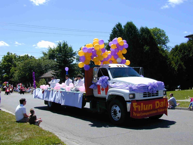 游行时,学员们身着传统的中国民族服装,走在最前面的是两位小弟子,随之三位弟子迎风奋力拉开黄底红字的“法轮大法”的横幅。后面是用法轮旗帜,彩带气球装扮地十分典雅,庄严,具有东方特色的大彩车。伴随着普度、济世的音乐,车上的弟子们分别演示着五套功法。同时还反复播放着弟子们自己赶制的英语录音:“法轮大法修炼者祝大家国庆愉快”,“法轮大法是以宇宙特性‘真,善,忍’为法理的古老的身心修炼方法”,“法轮大法是世界上最大的志愿者系统”,“请帮助我们制止中国对法轮大法和法轮大法修炼者的镇压与迫害”。几位弟子向路两侧的人们分发真相报纸和彩旗。沿途人群对我们报以阵阵热烈的掌声。为数不多的华人更是用力挥动手中的彩旗,向“真,善,忍”致意,使大家很受鼓舞。