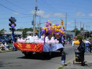 六月三十日晚上的一场雨,驱走了几天来的闷热。七月一日上午大风骤起,又将满天乌云一扫而光。弟子们提前来到游行出发地点,紧张而有序地装扮彩车,连两位来探亲的老人也踊跃加入进来,一切都显得那么祥和且生机勃勃。一对西人老年弟子由于家中有客,原以为不能参加游行。而当大家忙于装扮彩车时,他们却出现了。原来他们的客人在十一点钟时便告辞了,似乎有意让他们来参加游行。