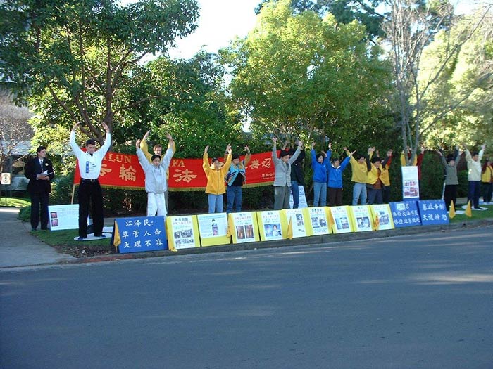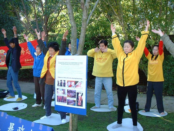 当得知15名女大法弟子在万家劳教所被残害致死的消息之后,墨尔本学员于7月4日上午10点在中国驻墨尔本总领馆门前举行了新闻发布会,向世人揭露江泽民流氓集团的残暴以及中国法轮功学员随时都有生命危险的紧急情况。学员们分别于10点、11点和12点发正念铲除邪恶,在寒风中炼功、静坐。有不少过路行人停下来看图片版、索要资料。一位来自广州的中年妇女非常同情国内学员的遭遇,对我们的行动表示钦佩。一位西人中年男子在发布会结束后仔细地询问法轮功的情况。