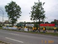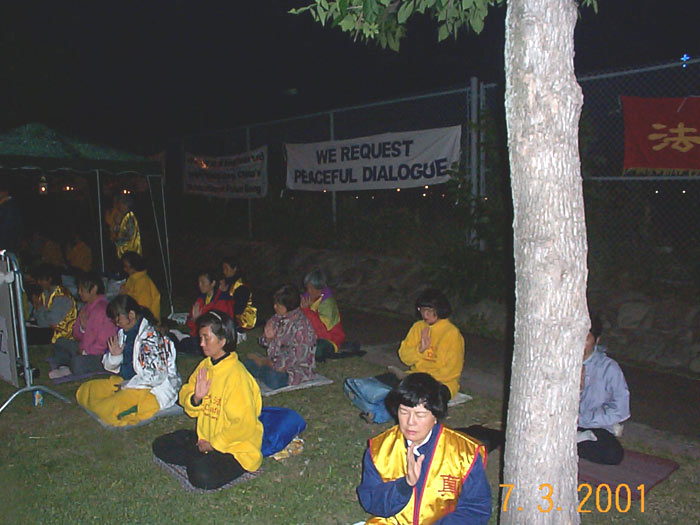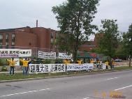 下午,一些学员连续打坐发正念,铲除邪恶。4:00左右,大家再次集体炼功。此刻,高峰期的过往的汽车,如潮水般涌来。汽车在学员面前缓缓驶过,无数目光在醒目的横幅标语上聚焦。“紧急呼救!(SOS) 停止对中国法轮功学员的虐杀”,“被迫害致死的中国法轮功学员已达250人”。善良的人们啊,你们知道吗,在中国,一群追求真,善,忍的佛法修炼者,在遭受残忍的虐杀。许多过往的车辆为我们鸣笛支持,还有一些善良的人从车中伸出手臂,向我们挥手致意。