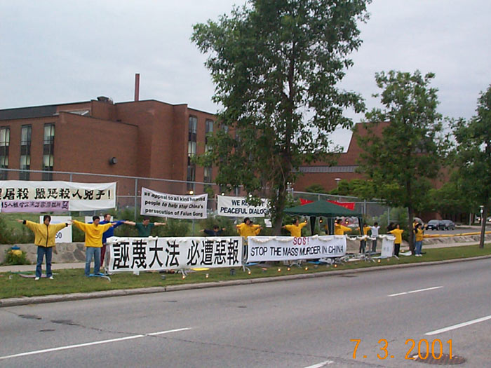 为制止江泽民犯罪集团残酷迫害无辜善良的法轮大法学员,让世界所有善良的人民知道发生在21世纪中国的骇人听闻的屠杀, 渥太华及蒙特利尔学员决定从7月3日上午9点到7月4日上午,连续24小时在中国驻加拿大使馆前强烈呼吁:制止血腥屠杀法轮大法学员,严惩凶手。