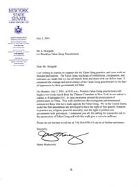 纽约州二十区参议员致信法轮功创始人李洪志先生