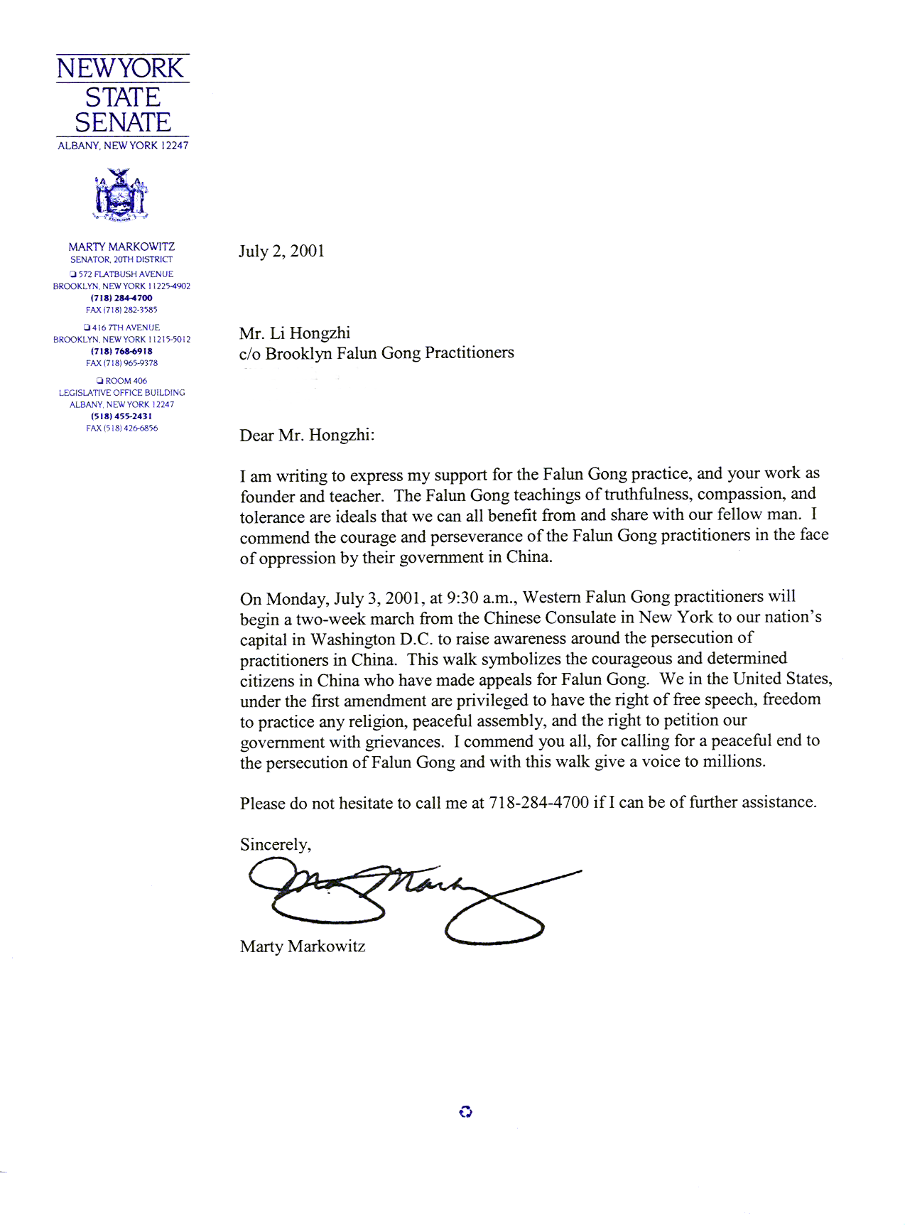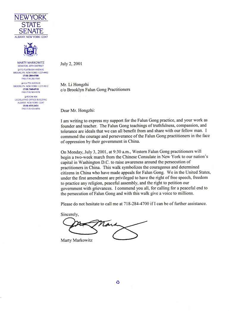 【明慧网2001年7月6日】纽约州二十区参议员马迪.马克维茨2001年7月2日致信法轮功创始人李洪志先生,表达对法轮功修炼、对作为法轮功创始人李洪志先生所做工作的支持。译文如下: