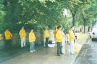 出发前,天就阴暗的仿佛要下雨,果然,我们刚到使馆前面,雨就下了起来。象往常集体活动一样,大家先坐下来齐发正念,“法正乾坤,邪恶全灭”。 在使馆两侧,摆满了真相介绍板和死难弟子的照片,使进出和路过使馆的人都能看到发生在中国的邪恶,并拿走了介绍真相的材料。