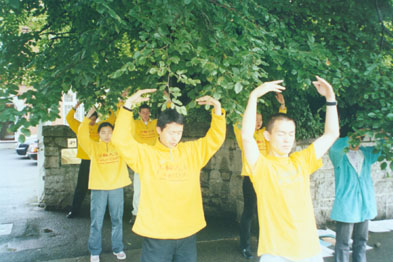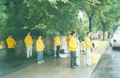 本以为雨下得那么大,不会有媒体来了。后来我们本着做而不求的想法,发正念、炼功,向警察洪法,并把我们写给使馆的信递到使馆里面去了。然而不久,爱尔兰最大也是最具权威的报纸——“爱尔兰时报”两个报道组分别派了记者来采访我们。他们驻中国的特派记者也是天天有报道。报道在第二天的报纸登出来了,伴有学员炼功的大照片。