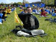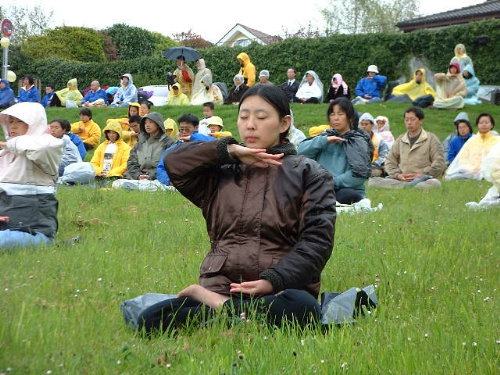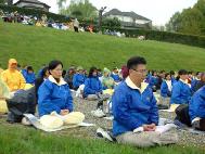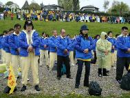到了炼功点,首先看到的是当地学员摆放在路边的洪法资料。许多过往行人停下来耐心地听弟子们介绍大法。台湾来的学员穿着天蓝色的炼功服排成方阵,在雨中整齐、安静地打坐。各国的弟子们在打坐结束后又炼了动功。