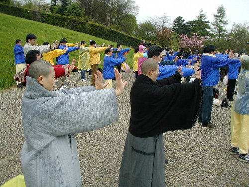 学员们非常珍惜这一难得的大型集体炼功机会。炼功持续了三个小时。在结束后下山的路上竟然下起雪来,再抬头看看则是蓝天白云,仅几分钟雪就停了,这也是日内瓦的奇景之一吧。