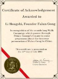 【明慧网2001年8月1日】马里兰州乔治王子郡行政主管于2001年7月17日发布褒奖状,赞扬途经本地历时一个月的SOS长途步行活动,此次步行活动旨在唤起世人关注中国(江泽民犯罪集团)对法轮功长达两年的残酷
