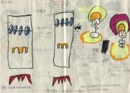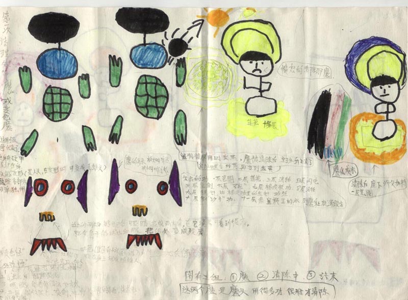 1、 这用绿色代表了它身有硬甲保护全身,头能变形(是人头,在变形时可变成青蛙头),这些各部分可单独使用。紫色三角形代表魔的耳朵,放大时听远处,收小时听近处。1.人头帮助它思维非常快;2.青蛙身能跳很高;3.魔眼能看到很远,如北京;4.三鼻能放黑气、喷箭、放电;5.魔牙边上的两个能配合眼睛变成两大角,在它境界可看到很高,配合鼻子能吐出血腥,把伤处变成残废,中间的三个牙能吐尖刀伤人,吐脚印粘在身上就成植物人,吐花里面有小水滴进入身体内就会得疾病。