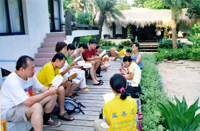 由于这次算是学员的朋友邀请,这位朋友也招待我们到他的住所,并准备食物、饮料,让我们取用。那是一处布置相当有异国风味的沙滩,蓝天中流动着被微风吹散的云絮,椰子树、斜阳、与海浪拍打的声音,再加上柔和的音乐,刚开始还真的差点沉浸到度假的错觉里。然而我们没有忘记人类只是像个过客一样地在世间小住罢了,又怎能留恋客栈里小小的一幅美丽风景画呢?在用餐、休息的这段时间,除了和身边的常人洪法,也向那些为我们准备食物的人们洪法,剩余的一些时间,我们则拿来读书、交流。