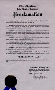 【明慧网2001年8月17日】路易斯安那州查尔斯湖市宣布2001年3月17日为“法轮大法日”。