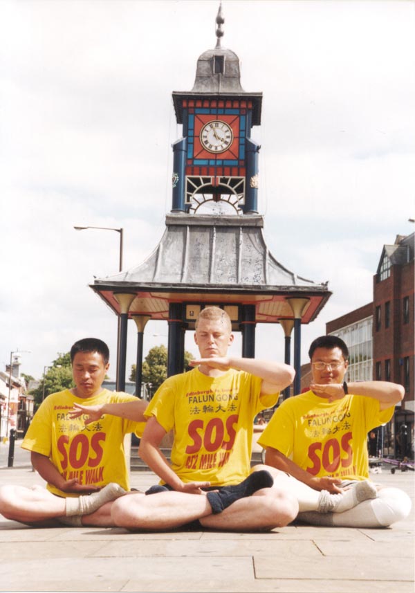 三名修炼者上个星期在他们452英哩徒步旅途中在丹斯泰保(Dunstable)展示了炼功动作。