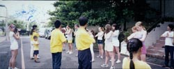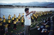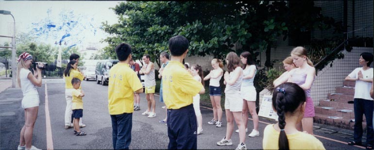 第三天是对韩国表演团,这团都是小朋友,差不多都十岁出头。他们学得十分有兴趣,但可惜的是他们领导反映说因下午有表演,无法流过多的汗,因此他们只学了第一套功法。但我们还是觉得这是一个非常难得的机缘,能够相聚的缘份。