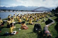 接着我们跟着师父的口令与大法的音乐一同炼功,学员去帮忙纠正动作,那是一个非常祥和的场,其中那位把第五套功法学会的贝南青年也来跟我们一起炼,那位随队翻译也跟我们一起炼。那时在我面前一位西班牙青年闭着眼睛非常专注,但他不懂中文,在炼第三套功法时他不知道已经开始冲灌了,直到我们提醒,他才一脸讶异的出手,随即又闭上眼认真地做,原来他已记住了。但到推转法轮时,因我们没讲清楚推四次,他推了好多次才结印,仍是闭着眼的,好像一个天真的小孩。到第五套功法时,我在最后结印入定后睁眼瞄了一下,只见一个个清新的面孔,闭目静静地在那坐着,包括那位翻译,也跟我们一起坐,还采用双盘。虽然整个炼功过程只短短的不到三十分钟,但望着这群西班牙朋友,心中有个念头:不知是否其中某位将来便是大法的骨干精英?
