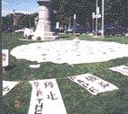 多伦多大法弟子在安大略省省政府草坪前,在人潮如涌的安大略湖畔,向世人讲清真相,并向人们展示了长裙 。几天来,无论我们出现在那里,在我们的周围都会聚集着众多关注的目光和急切的询问,人们难以相信在中国竟会发生这样残酷的事实,许多人问我们,法轮功是什么,中国为什么镇压你们。我们的学员指着身穿白色长裙平静祥和的女大法弟子,和在周围炼功的学员,告诉人们法轮功学员修炼这种舒展祥和的五套功法,同时他们按照“真善忍”的原则作好人,他们追求着美好的精神境界。两年前的中国,有上亿的法轮功修炼者,他们通过修炼获得了身心的受益。然而,中国大陆掌握专政大权的几个邪恶却对这样的善良民众进行了惨无人道的血腥镇压。