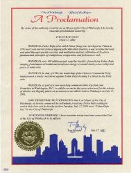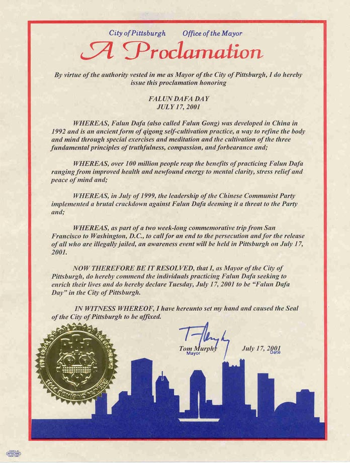 因此,现在依照决议,我,匹兹堡市市长在此表彰为丰富他们的生命而修炼法轮大法的人们,并在此宣布2001年7月17日为匹兹堡市"法轮大法日"。