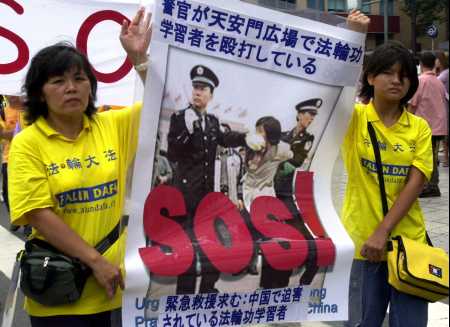 图片一:法轮功学员在8月18日于日本东京的一个请愿中,手持一幅显示北京警察对一学员动武的图片。当天超过300名包括日本人,中国人和台湾人在内的学员走上街头,向公众诉说中国应停止对法轮功的暴行,并呼吁帮助营救其在中国受虐待的同修。(美联社/Chiaki Tsukumo) )