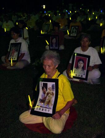 图片二:法轮功学员在8月18日于日本东京的一个请愿中,手持他们在中国受虐死亡的同修的照片并表悼念。(美联社/Chiaki Tsukumo)