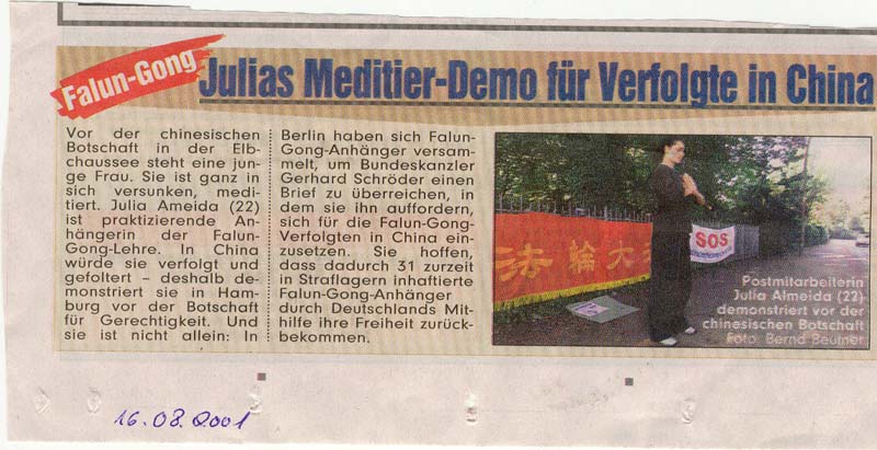 易北大道上的中国领馆前有一个年轻姑娘,她在那打坐炼功,深深入定。尤利亚丝-阿美达,22岁,是一个法轮功修炼者。法轮功修炼者在中国被迫害和遭受酷刑-- 也正因此尤利亚丝才在汉堡的领馆为了正义而抗议。当然尤利亚丝不是单枪匹马:法轮功修炼者聚集在柏林,他们递送给总理施罗德先生一封信,在信中他们呼吁总理先生致力帮助在中国遭受迫害的法轮功学员。尤利亚丝希望,那31位(译者:应为130位)被关押在劳改营的法轮功学员能在德国人民的共同帮助下重新获得他们的自由。