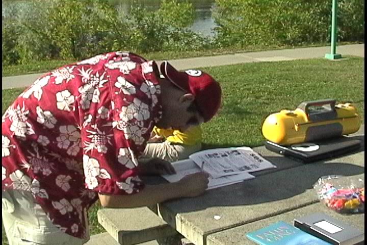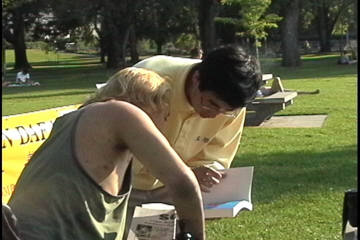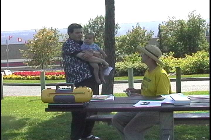于下午6:00到达奇力瓦克(CHILLIWACK)公共图书馆,捐赠《法轮功》英文版。随后,在附近小公园摆好桌子、材料、义务教功旗和展架。随着“普度”、“济世”的音乐,开始了那里的洪法。有五、六个在附近聊天的年轻人看到我们后,主动询问:什么是法轮功?当知道了在中国发生的迫害后,当即签名表示支持法轮功。有一位五十岁左右的中年人非常喜欢听“普度”与“济世”,一直坐在附近的长椅上,一边读着大法报纸,一边聆听音乐。我在洪法车旁边整理资料时,他过来开始与我聊天。说起他一生如何坎坷。对东方文化,特别是道家学,他说有一些了解。当我提到法轮功已遍及40多个国家、跨越各个民族,〈〈转法轮〉〉已被翻译成许多种语言时,他说:“我刚才看了报纸,还有德语版的呢!我懂德文。”当我提到五套功法时,他说:“报纸上也介绍了,很详细。”可见他读报纸时的专注。话题逐见转到了关于人世、轮回、业力和人为什么承受痛苦,似乎他亦有所接受。他很想了解,并问哪里可以购买书时。我想这人可能就是来得法的。送了〈〈转法轮〉〉和教功录像带给他,希望他能早日得法。