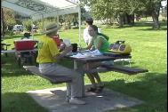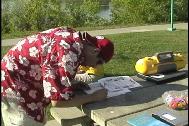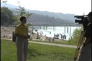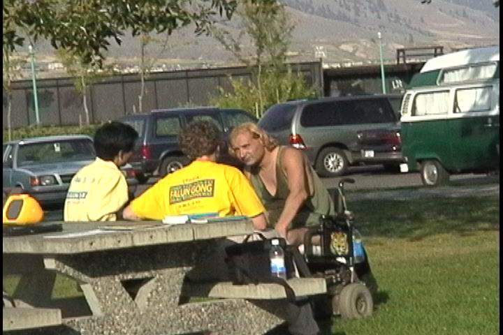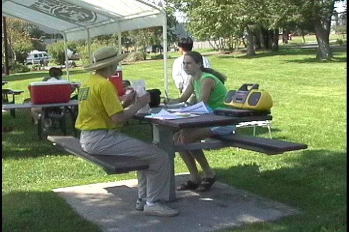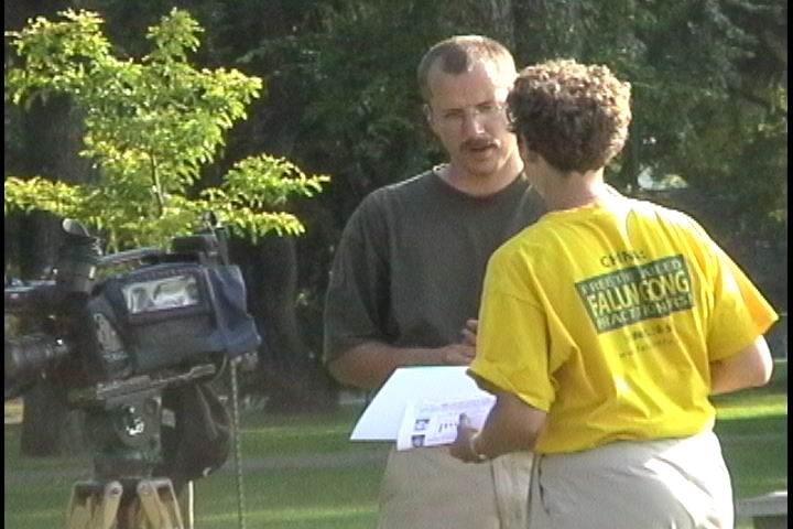 下午到达堪幕露普(KAMLOOP)。在公园里接受了一位记者的采访。他已对法轮功有所知道,所以提问较细致、深入。对在中国大陆发生的迫害包括自焚等亦作了详尽的了解。我们送了一盘自焚录像带给他。整个采访时间大约有一个半小时。当我们快要离开时,有另一家媒体来公园拍摄场景,正巧看到了洪法车和炼功场面,于是即兴采访了学员安得烈(ANDREA),拍了炼功场面,真是太巧了!