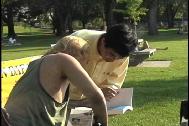 下午我们在河边(RIVERSIDE)公园炼功、洪法,遇到了许多有缘人。刚开始,就有两个八、九岁左右的小孩过来。其中的小女孩很喜欢静坐,说她经常在放学后打坐。两个小孩跟安得烈学了五套功法,动作做得很好。当安得烈告诉孩子们中国法轮功学员所承受的苦难时,这位小女孩表情严肃地说:“为高贵和尊严而死,值得。”当听说有教功录像带时,她说想买。安得烈送一盘教功带给她。她说会天天看,并与朋友共享。当我们要离开时,小女孩不忘跑过来说:“谢谢你。一路顺风!”