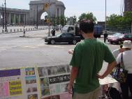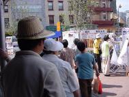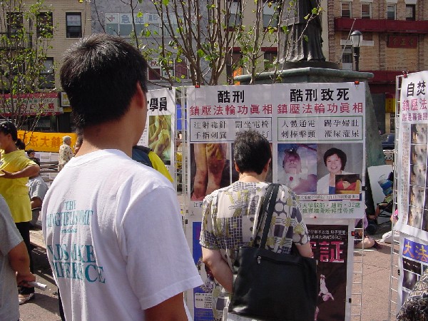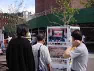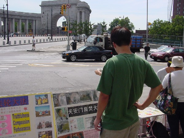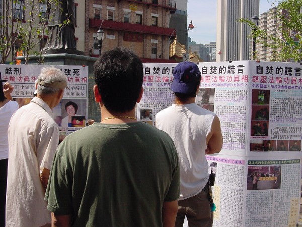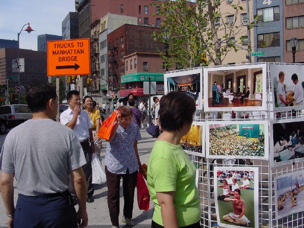 孔子像广场位于中国城中心,位于五条街的交接处的三角地带。周末更是行人和车辆的必经之地。学员们充分利用这特殊的有利地势。大家智慧地把大量讲清真象、正法之路的图片、学员炼功场面的大型海报以及中英文法轮大法横幅摆了一圈。图片醒目地对向各个方向,使所有的过往行人和车流都能看到。整个洪法点布置得非常壮观。学员们在里面炼功。高音喇叭里反复播放着法轮功的神奇故事,及“4-25集体上访”,“天安门自焚”等真象。许多行人或在图片前驻足,认真仔细地观看,或认真地聆听真象广播,对中国法轮功学员的悲惨遭遇深表同情,对江泽民政府的暴行表示不解和愤慨。放资料的桌子面向人最多的一面,不少人自动来拿资料。
