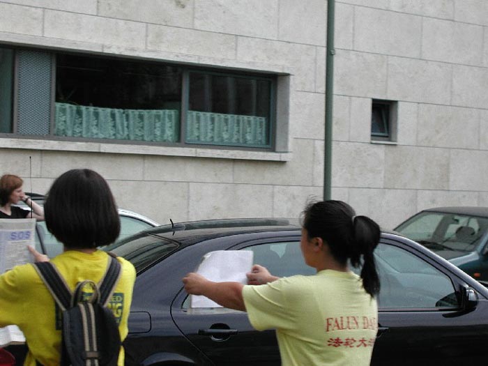 那天,学员们一早就挂好了大横幅“SOS”,“法轮大法”,“紧急救援,刻不容缓”及各种呼吁停止屠杀的横幅。其中的一副引起众多的行人注目:“施莱德总理:已经沉默两年了,268人已死,7百万人被镇压,请立即采取措施!”帝国大厦参观的游人络绎不绝。看到学员紧急呼吁的情景与和平炼功场面,纷纷拍照,索要资料。他们对江政府的暴力行径感到十分震惊,并在向德国总理呼吁书上签字。