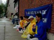 周六晚上,芝加哥领馆前仍是行人不断,非常热闹。不少行人停留驻足观看学员的炼功和“紧急呼吁救援大陆受迫害的法轮功学员”及大陆受迫害学员的图片和信息,也有路人接过了学员递送的真相材料。晚12:00后,这里的行人仍然如织。但绝大多数都是一些出来享受夜生活的人,因此魔性较大,穿着奇形怪状的衣服,放着震耳欲聋的音乐,材料发出去的也不多。经过一天的活动,弟子们有些疲倦,但当被问及是否回车上休息一下时,弟子们却说来到这里就是炼功、发传单的,不是来睡觉的。天上仍飘着细雨,望着眼前滚滚红尘中的人们,心中升起无限慈悲,他们也都是为法而来,即使不接材料,让他们看一看大法弟子在风雨中凛然不动的气概,也是好的。于是我们决定继续练功,弟子们的宁静祥和与周围的嘈杂环境形成鲜明对比。我仿佛觉得炼功的音乐是从天外传来,法轮在身体里迅速旋转着,我知道师父就在身边。凌晨两点半后,街上渐渐安静下来,学员们才回车上休息。