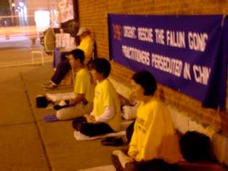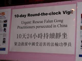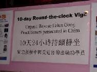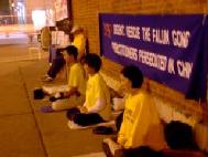 | 10天24小时芝加哥学员呼吁牌 | 深夜在炼功的学员们 | 一夜后拂晓中继续炼功的学员们 |
