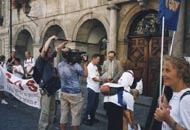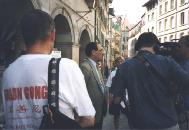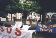 12时整我们的队伍从湖边出发了,记者和法轮功的支持者跟随我们走了很长一段路。在市中心广场,我们停留了一小时,向行人展示了中国法轮功学员遭受迫害的照片,那些惨不忍睹的酷刑照片,令一些参观者捂起了眼睛并对迫害予以谴责。很多人主动来取“SOS紧急救援”的材料。一名中年妇女,看到大法材料之后说:“我支持法轮功。”并加入我们的游行队伍。许多学员和支持者一直把参加步行的学员送到郊外,沿途学员们背着喇叭,用三种语言向人们讲真相。 日内瓦小分队的步行今天已进入第三天。由于是周末,一些在工作日不能参加的学员也加入到步行的行列,使小分队的人数增至27人。一位家住洛桑地区的学员,工作时,听到了学员洪法的音乐声,激动不已。第二天一早坐了两次出租车,终于找到了步行小分队。两位出租车司机都告诉她,昨天看到了步行的法轮功学员,很受感动。 当小分队到达莫局斯市(Morges)时,受到了该市副市长的热情接待。他在昨天晚上接到了电话,本来今天不工作,但他特意赶来,把小分队的全体成员请进市政府会议厅。他接过弟子们送给他的法轮功真相资料说:“很高兴见到你们,非常支持你们的行动,祝你们成功”。他并表示会在市政府的会议上提出法轮功的问题。 当小分队到达世界名城洛桑(Lausanne)时,政府秘书长已在市政厅前等候。他与法轮功学员进行了较长时间的交谈,并接受了媒体的采访。他指出:“我们市政府一贯致力于保护人权,我们也十分关注中国镇压法轮功的严峻形势,支持你们为维护法轮功学员的人权所进行的活动,祝你们此行成功。”并表示会向市长汇报我们的情况。 洛桑市政厅位于市中心繁华地带,游人如织。弟子们展开横幅,不失时机地向游人散发传单,电视台的记者拍下了这些珍贵的镜头。在洛桑国际奥委会总部前洪法时,我们巧遇到欧洲旅游的一位台湾女士感叹地说:“到处是法轮功,太神奇了!我刚刚在欧洲其他几个国家遇到过,今天又在这里看到了你们”。媒体的记者继续跟踪采访报道我们的行动,除了法语区的记者外,意大利语区电视台的记者也赶来,几乎跟了我们半天。小分队所到之处,受到当地官员、警察及居民的欢迎和支持。警察主动询问我们有什么困难,遇到了什么麻烦,并给我们建议最佳路线,他们很乐意接受法轮功的资料,表示会保护法轮功学员的安全。在经过一个小镇时,居民们打开窗户向弟子们招手,向我们喊“加油!”“太好了!”一位妇女在楼上大声嘱咐“请在楼下给我放两份资料,要两份!”行进中,有一次走错了路,误入私人领地,本以为会引起主人的不快,没想到主人爽快地说,“没问题,你们可以穿过”。原来他已经听说了法轮功学员步行到伯尔尼的消息(尽管此地十分偏僻,可谓前不着村,后不着店),弟子们走远后,他又特意赶上来,嘱咐我们该走哪条路。那情景真令人感动! 正如我们预料那样,瑞士弟子的这次活动,也受到中国驻瑞使馆的特别“关照”。连续三天,派人派车跟踪步行队伍,反复拍照,录像,这种异常举动,引起当地瑞士人的极大反感,一位目睹他们丑行的咖啡馆老板说“真是岂有此理!居然在我们瑞士的土地上这么干,这是违法行为!” 这两天小分队所经之地,道路状况不好,要翻山越岭,穿过树林,弟子们脚下布满血泡,踏在崎岖不平的山路上,异常疼痛,体力消耗也很大。一位拄着双拐艰难前进的女学员说:“一想到中国大陆弟子受到的野蛮迫害,我就不能停下来。”一位开车跟随队伍采访的记者,看到落在最后面的一位女学员在别人的搀扶下艰难地走着,就停下来说:“这里没有别人,我也不跟别人说,你上来我带你一段吧”。这位女学员说:“谢谢您的好意,法轮功讲“真、善、忍”,我一定步行坚持到底。”此话令那位记者大为感动。 圣加仑小分队的步行已进入第二天,学员们在瓦特维尔镇上,举行了新闻发布会。镇长被我们的行动所感动,特意赶来参加发布会,对我们表示支持。他高兴地接受了法轮功真相材料,并以“中国停止虐杀”的横幅为背景和学员们一起照了相。第二天的报纸将会刊登照片和相关报道。报社的记者还表示,我们虽不能跟踪报道,但你们可以自己写,自己拍,寄到报社,我们及时给予发表。行程中,我们碰巧发现了“苏黎世河广播电台”,学员上前按响了门铃,电台工作人员不仅热情接待了我们,还破天荒地让我们即时在电台上讲清真相7分钟。真是师父巧妙安排。 大家一边走一边发正念,默念师父的正法口诀,走起路来特别轻快,真的象有人推着一样。今天前进了37公里。