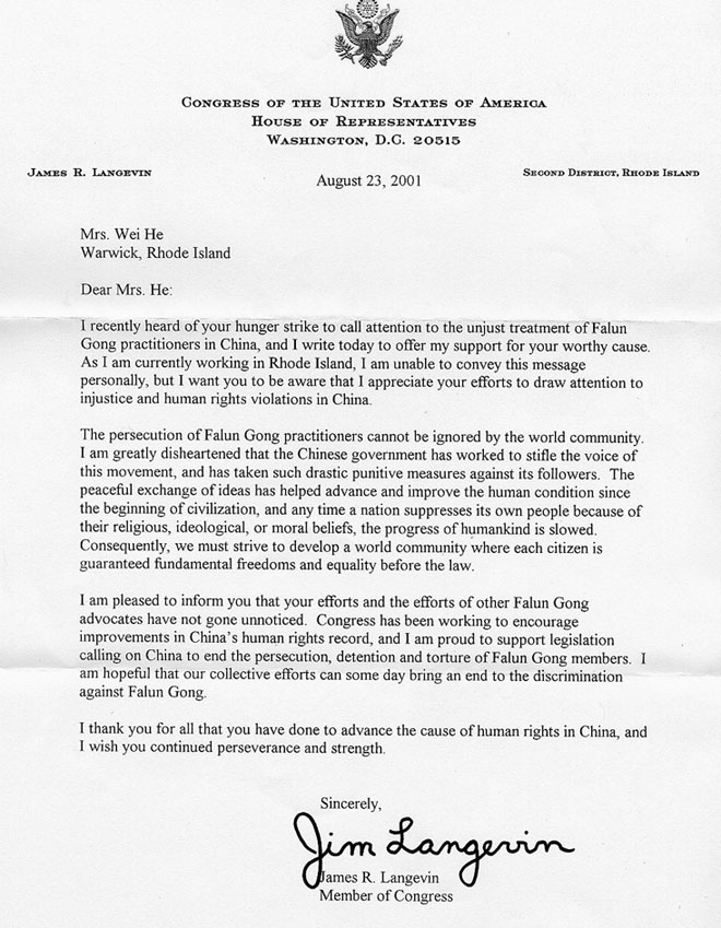 最近我得知你以绝食呼吁公众关注法轮功学员在中国遭到的不公正对待。今天,我在此提笔支持你值得尊敬的正义之举。因我现正在罗德岛,公职在身,无法亲自递交此信,但我希望你知道,我衷心感谢你为了促使公众关注发生在中国的不公正与践踏人权行为而做的努力。