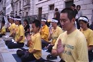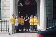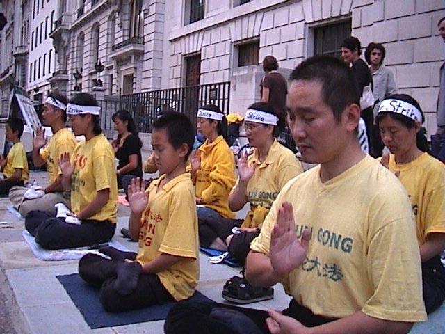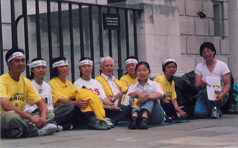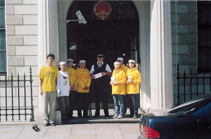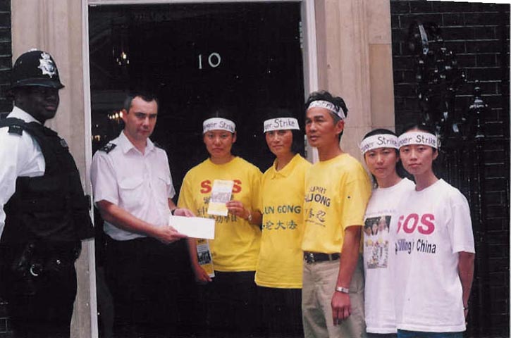 | 伦敦弟子在绝食行动结束前齐发正念。 | 中国大使馆拒不收请愿信,由值班警察代转。 | 在七十二小时的绝食绝水行动结束後,弟子前往首相府递交请愿信。 |