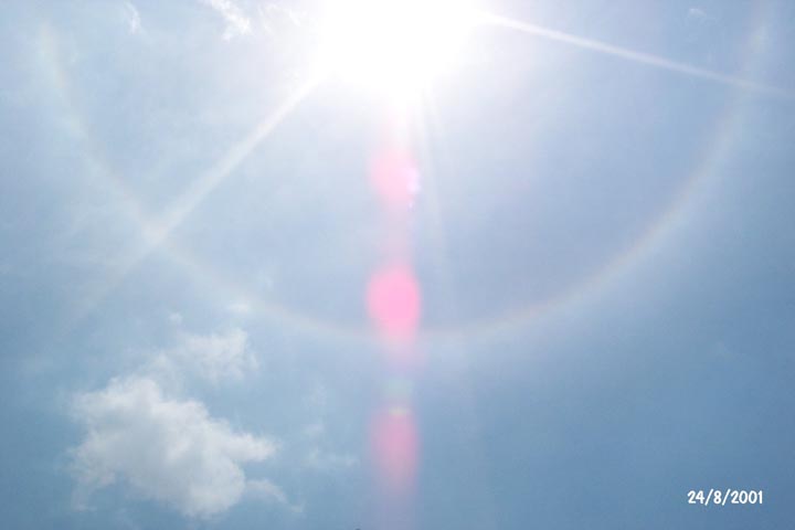 【明慧网2001年8月26日】8月24日下午1:40左右,新加坡上空的太阳周围出现一个五彩的大光环,一些大法弟子看到太阳中心有一个巨大的卍字符,整个景象构成一个大法轮。8月25日的《海峡时报》、《今日》报导了这一奇景并刊登了照片。