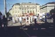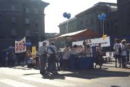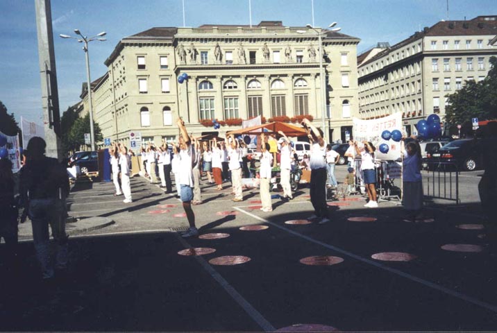 经过一个多星期的艰苦跋涉,瑞士大法弟子于8月23日早汇聚在瑞士首都伯尔尼的联邦广场并召开了新闻发布会。来自日内瓦、苏黎世、巴塞尔、圣加仑等地的大法弟子相见时,大家十分激动。特别是当大家看到了伯尔尼大法弟子刚刚赶制的写有“真、善、忍”三个大字的横幅时,异常亲切,感觉象回到家一样,有弟子看到当天早晨大法轮在空中旋转。