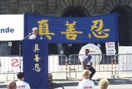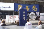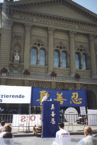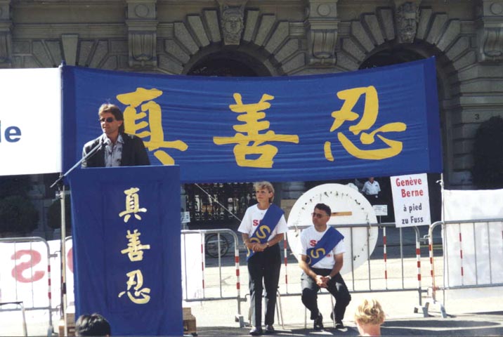 上午11点,“SOS紧急救援中国大陆受迫害的大法弟子”新闻发布会开始。两位瑞士大法弟子先后发言,向与会者介绍了以江泽民为代表的邪恶势力对法轮功弟子迫害不断升级的情况,呼吁善良的人民伸出援助之手,帮助制止对法轮功的镇压和迫害,释放所有被关押的法轮功学员,给他们以信仰和炼功的自由。来自日内瓦州的议员比西.托玛先生在他的发言中,以自己的亲身体会盛赞法轮功是一个神奇的自我修炼方法,他说镇压这一和平功法令人愤慨!瑞士有责任参与制止这种行为。