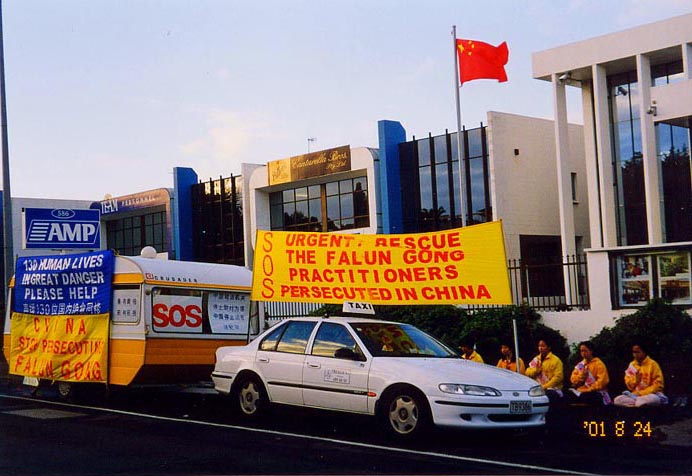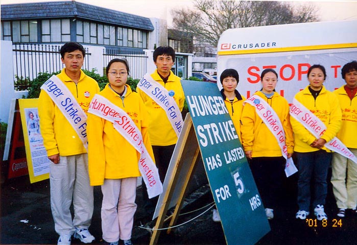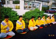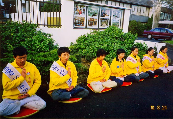 下午,天气一直阴沉沉的,风也越刮越猛,时而还夹着雨。但是,学员们迎风而坐,单手立掌,正念除恶。在正与邪的较量中,学员们决心用自己的承受,强烈要求江泽民政府停止对所有法轮功学员的迫害,唤醒更多的世人站出来支持正义。