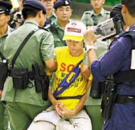苹果日报8月26日讯 - 十名香港法轮功学员昨日下午在中央政府驻港联络办公室门外静坐绝食,声援一百三十名在辽宁省被囚禁的内地学员绝食行动,但警方以阻街及滋扰市民的理由,强行将请愿者抬走,带返警署至傍晚才获释。