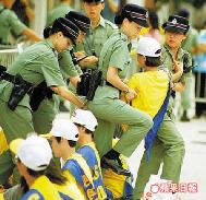 | 警员抬走在中联办外练功示威的法轮功学员。(美联社) | 女警出动抬走部分参加示威的法轮功女学员。(美联社) |