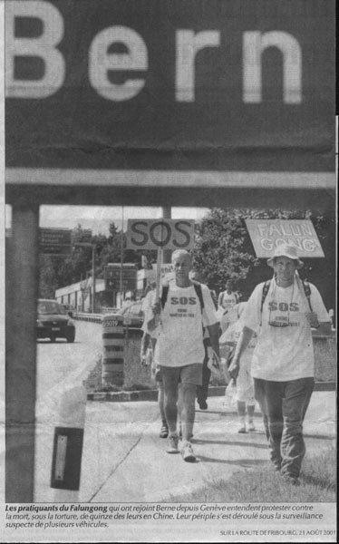 20多名法轮功步行者在28度(摄氏温度)高温下,行程128公里到达了弗赖堡州的NEYRUZ市,向伯尔尼挺进。他们身着白T恤,迈着坚定的步伐,一排排的、有秩序的、静静的向目的地走去。在这一行抗议者的队伍中,回响着温柔的中国乐曲声。在接连不断的蓝色、白色的标牌上,我们可以读到“SOS法轮功”及“援救法轮功弟子”等标语。在这条由ROMONT通往弗赖堡的公路上,车流缓缓减速,很多驾驶者以按喇叭与微笑来支持这群抗议者们,总之没有任何人无动于衷。已被中国镇压两年的法轮功修炼者们,上星期四从日内瓦的新广场出发,打算在本周四上午10点在伯尔尼政府广场前与来自于苏黎世、巴塞尔及圣加仑等地的其他的法轮功步行者会合。这次步行抗议的原因是因为六月底在中国黑龙江省的一个劳教所里,15名法轮功修炼者被酷刑致死。在头旁举着小标语旗的KYEJA LEE小姐微笑着说:“尽管我是一个微粒中的微粒子,但还是尽我所能让中国政府停止镇压我们。”